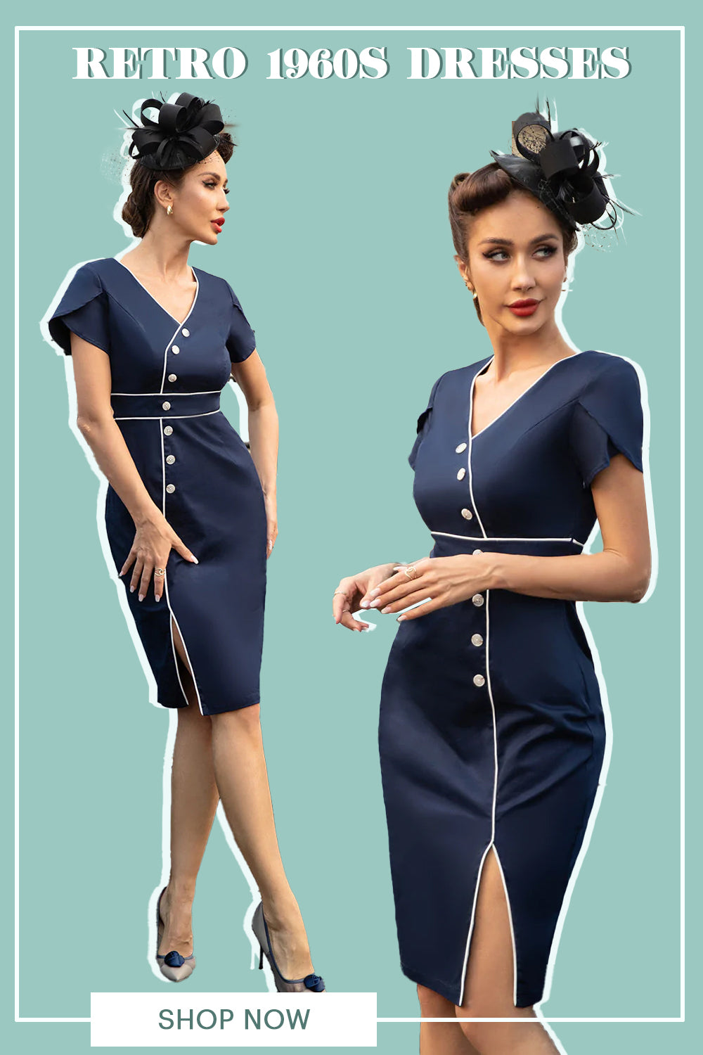 40’s fashion dresses: Classic a-line dresses, often with button-up detailing, short sleeves, lapel collars, and stylish belts at the high-rise waist are a timeless staple of 1940s women’s fashion. Midi dresses in floral prints, and vibrant solids (especially navy blue dresses) were all the rage during this era.
