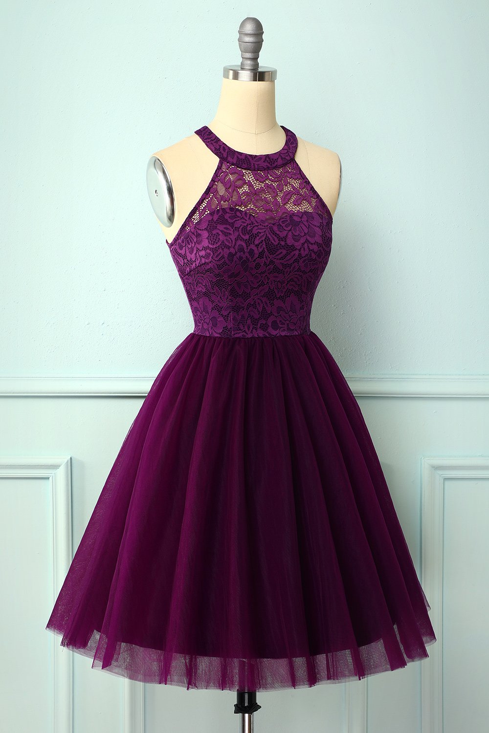 If you want to look like a smokeshow at your femily's next Christmas party, you have found it: this purple lace dress. Featuring a halter illusion neckline with a sweetheart bodice underneath this dress is sexy and original that is still demure, cute and classy so you can be charming and eyecatching without having to forget elegance; and the bodice then drifts off into a fluffy skirt covered by tulle that ends right above the knee to make you look adorable, like a little doll.