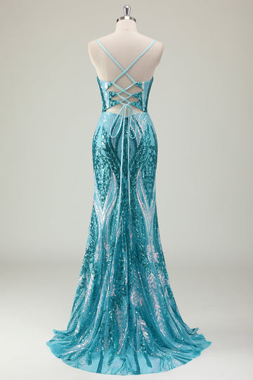 Sparkly Blue Mermaid Spaghetti Straps Long Prom Dress with Sequins