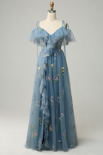 Whether you are dressing it for a prom, wedding party, evening party or any other occasions, this party dress will be your lovely partner. Product Details Tulle Embroidery A-Line Cold Shoulder With Slit Floor Length Cleaning Instructions: Hand Wash Do...