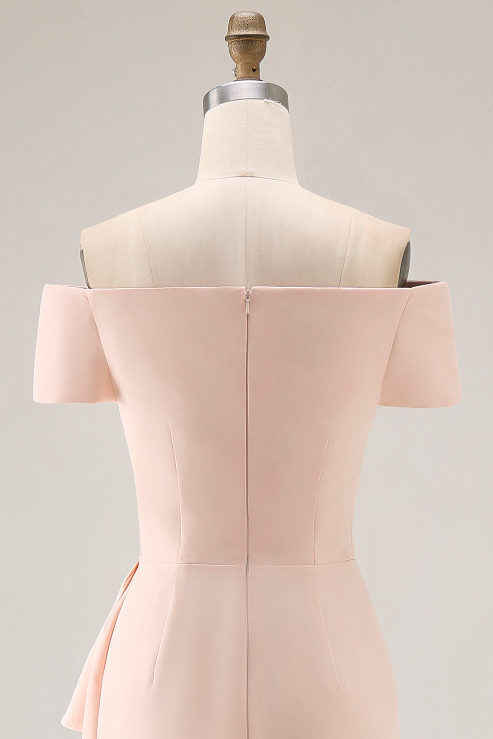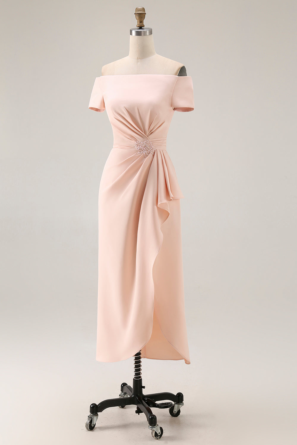 Apricot Off The Shoulder Ruched Sheath Mother Of The Bride Dress with Ruffle Slit