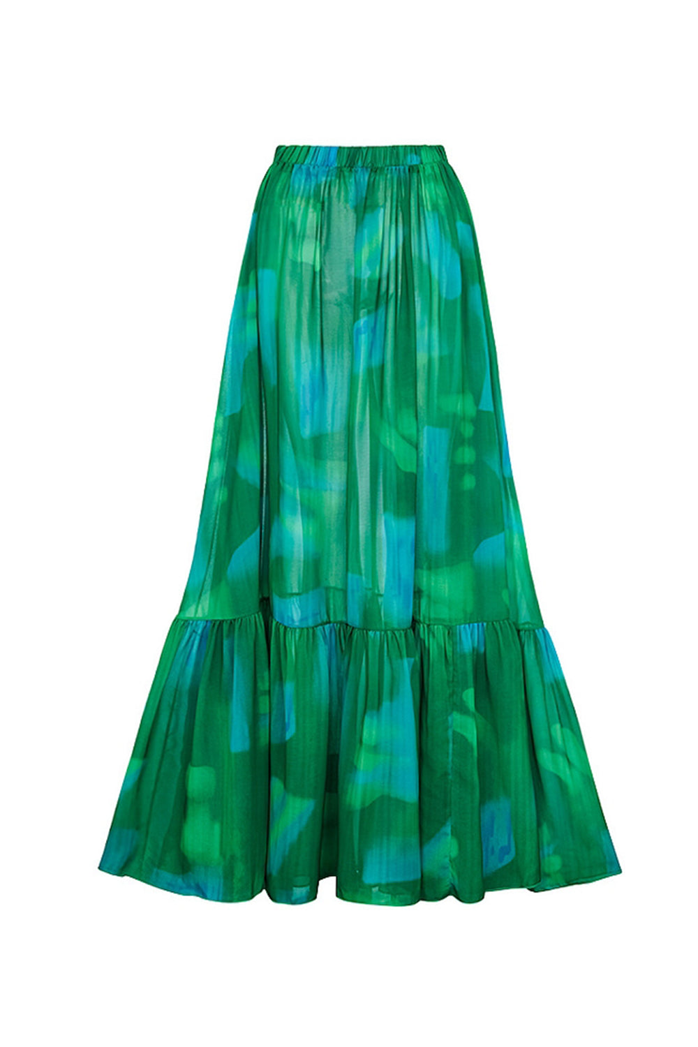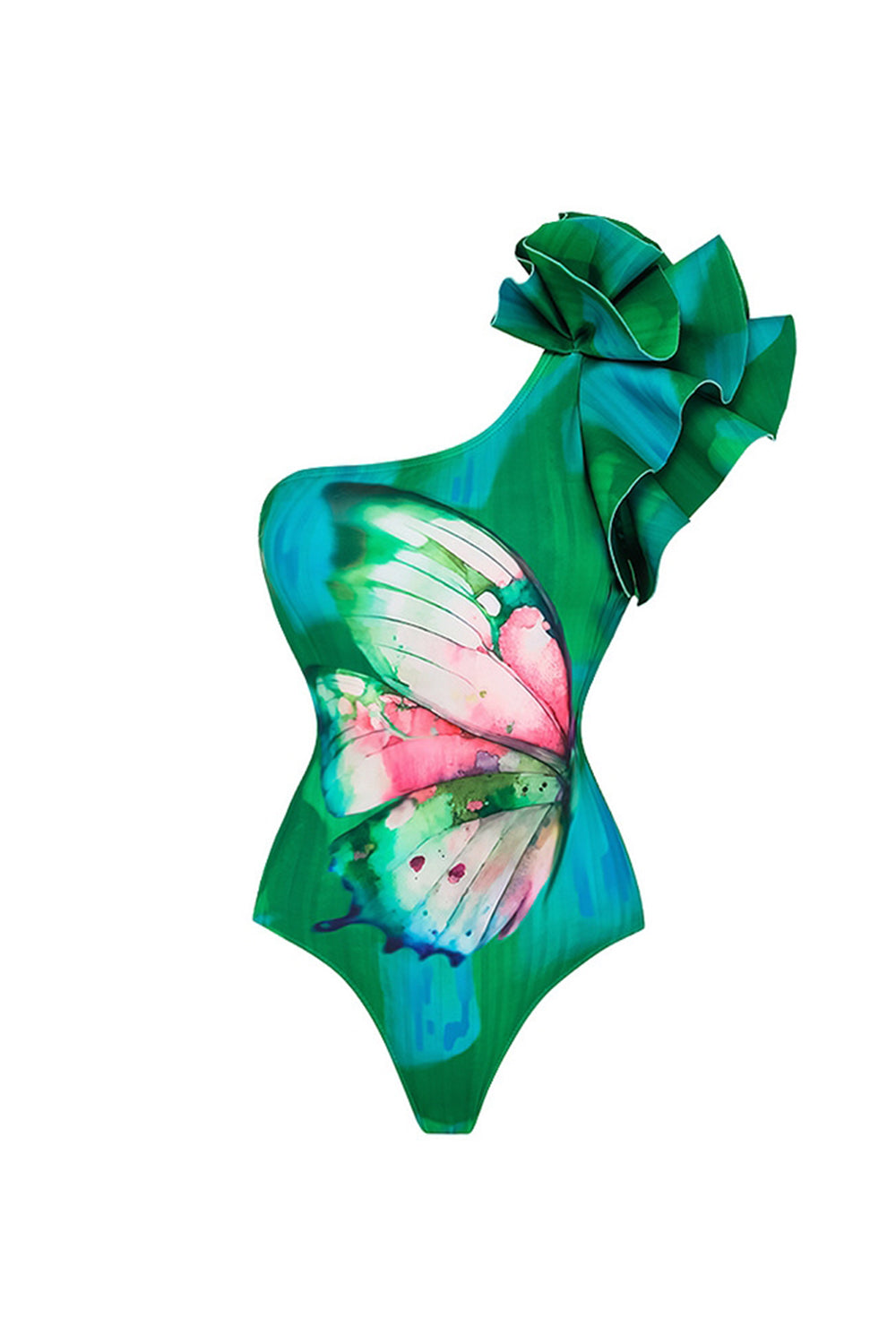 Dark Green One Shoulder Ruffled Printed Swimsuit