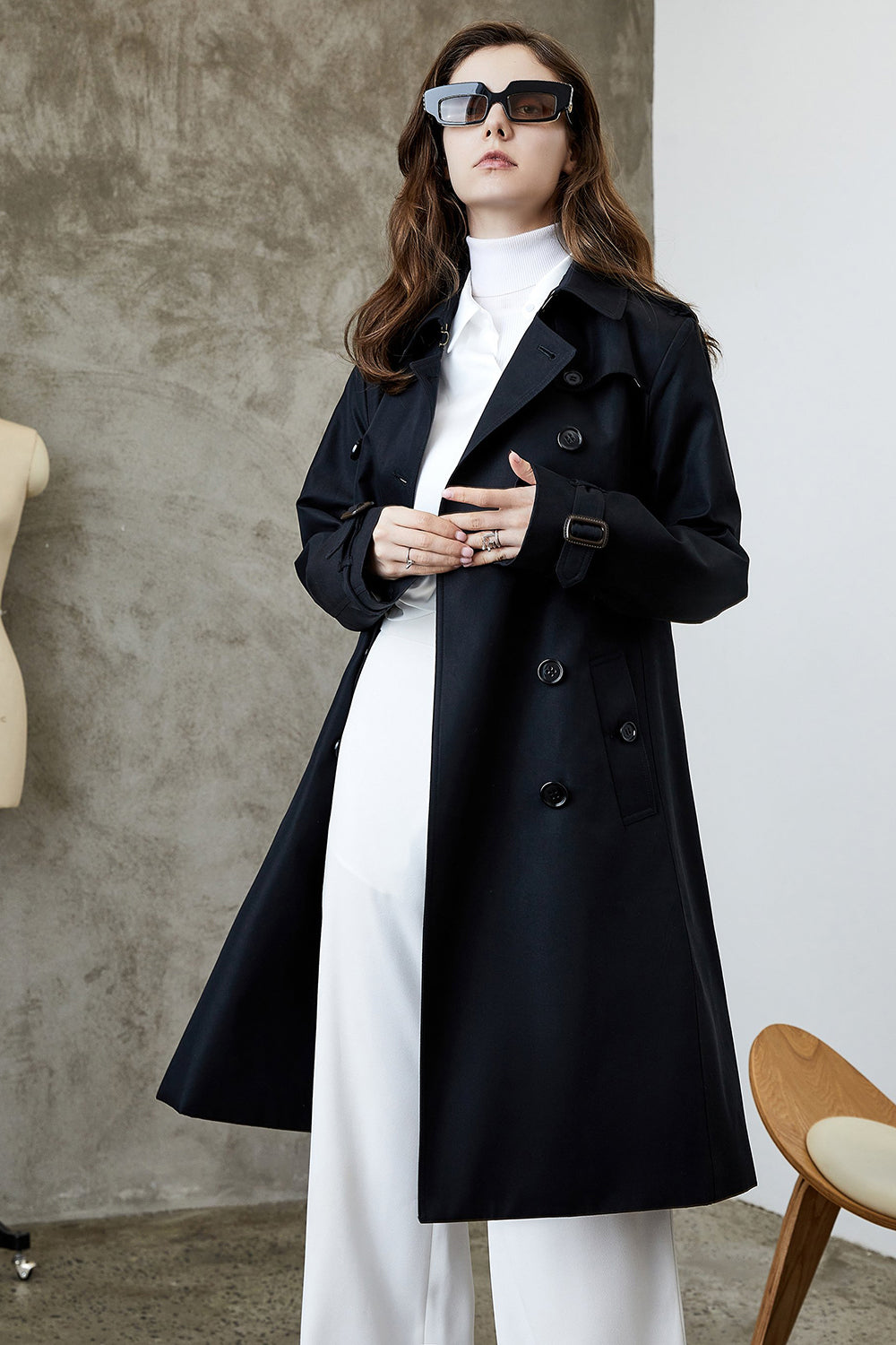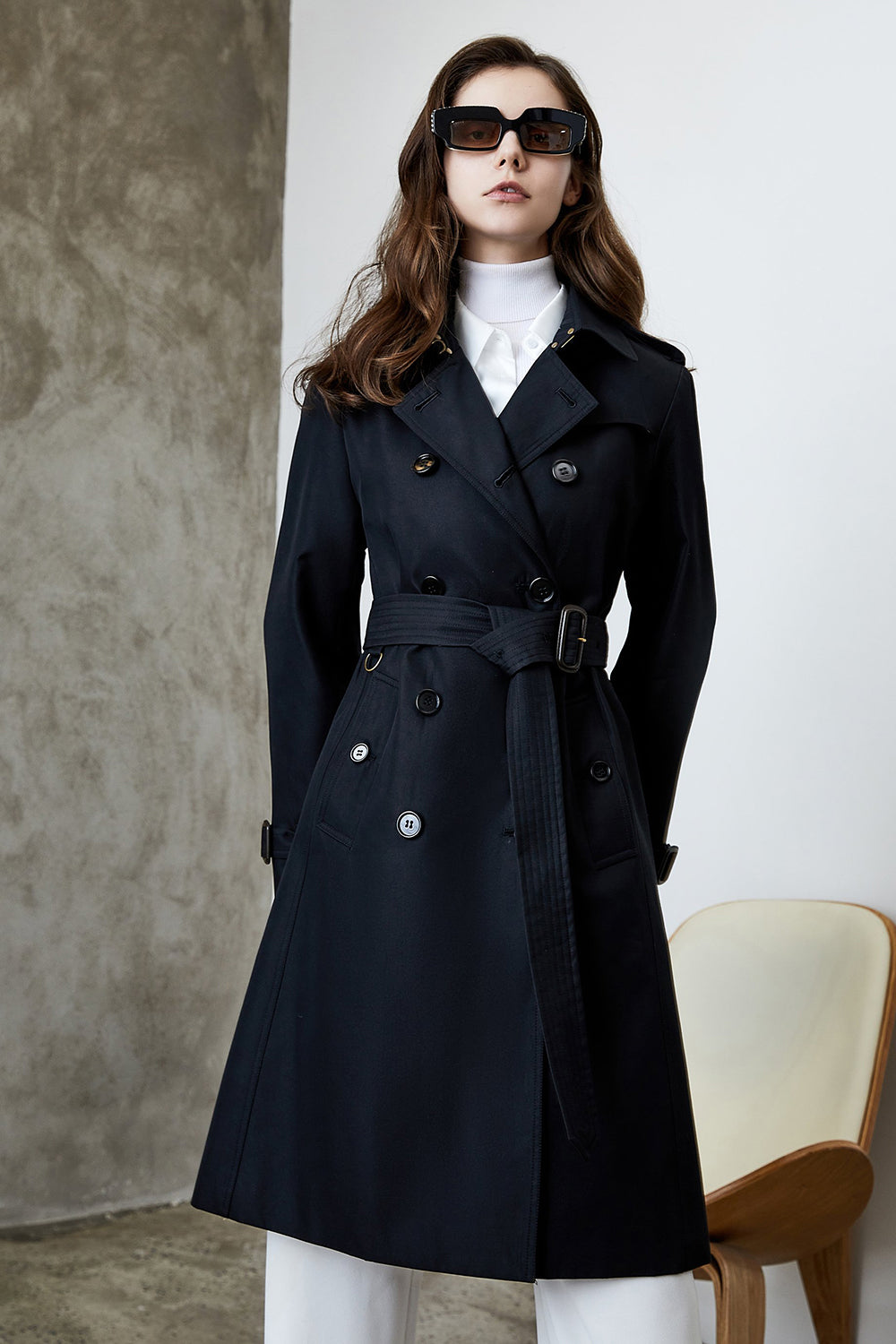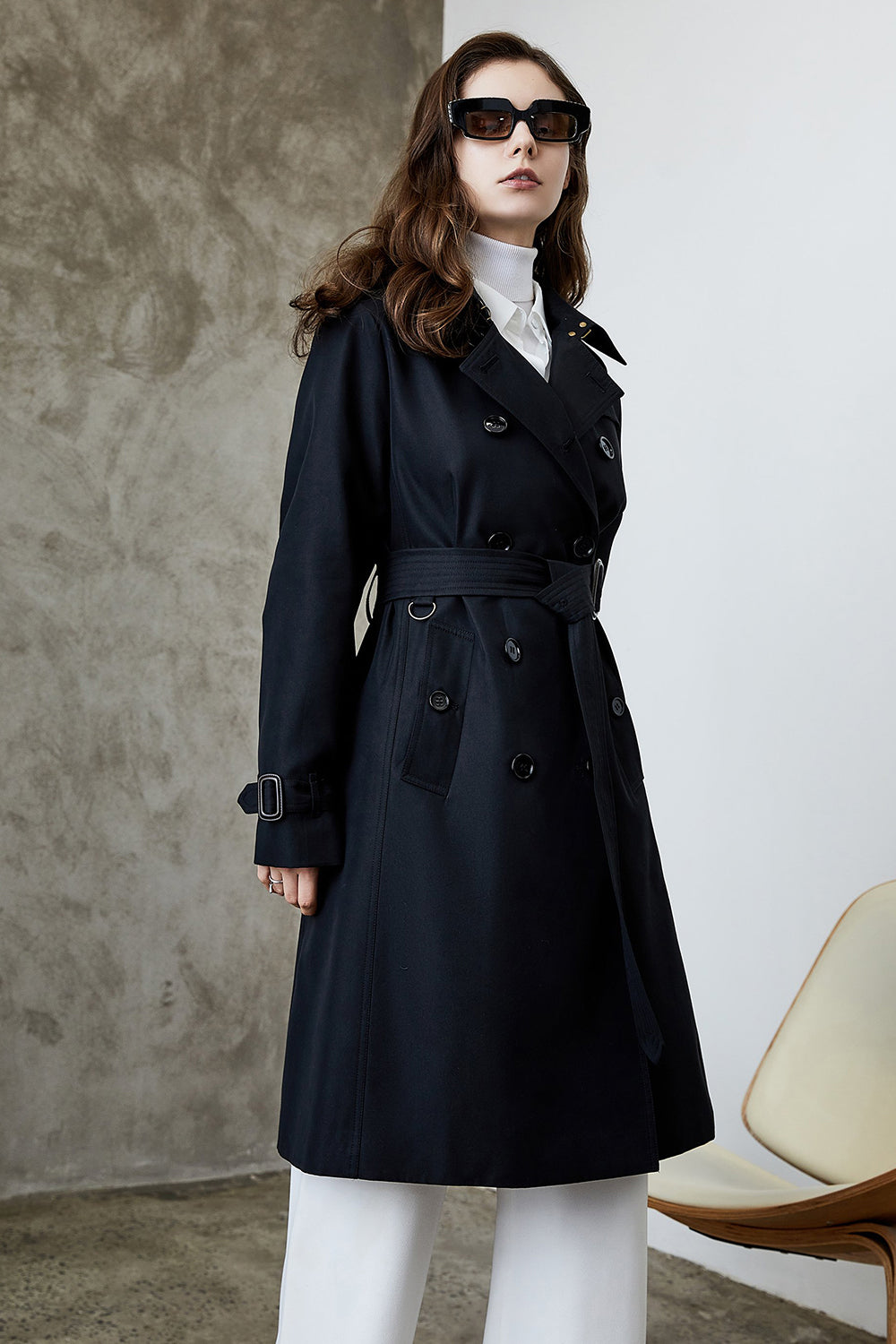Black Lapel Double Breasted Trench Coat with Belt