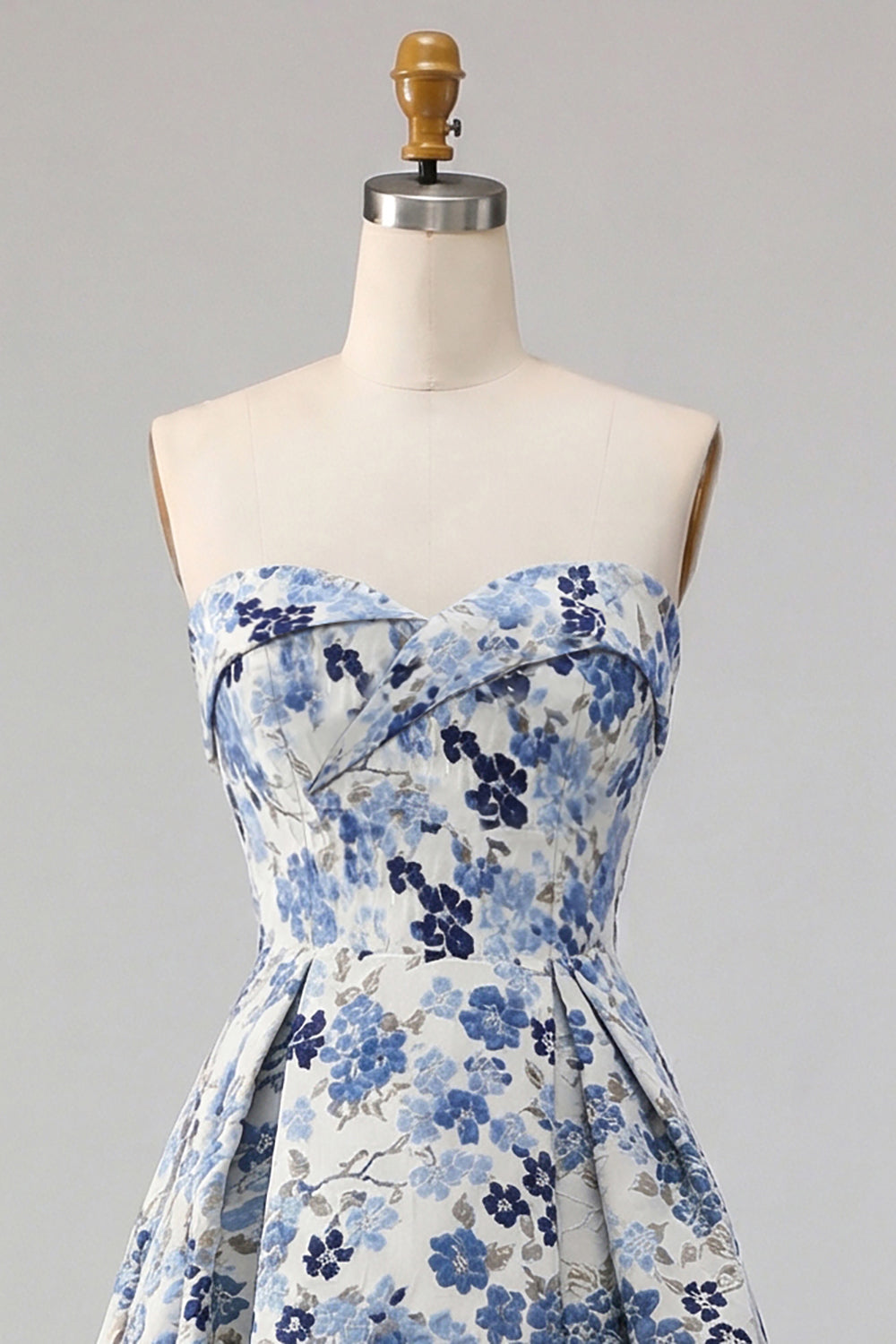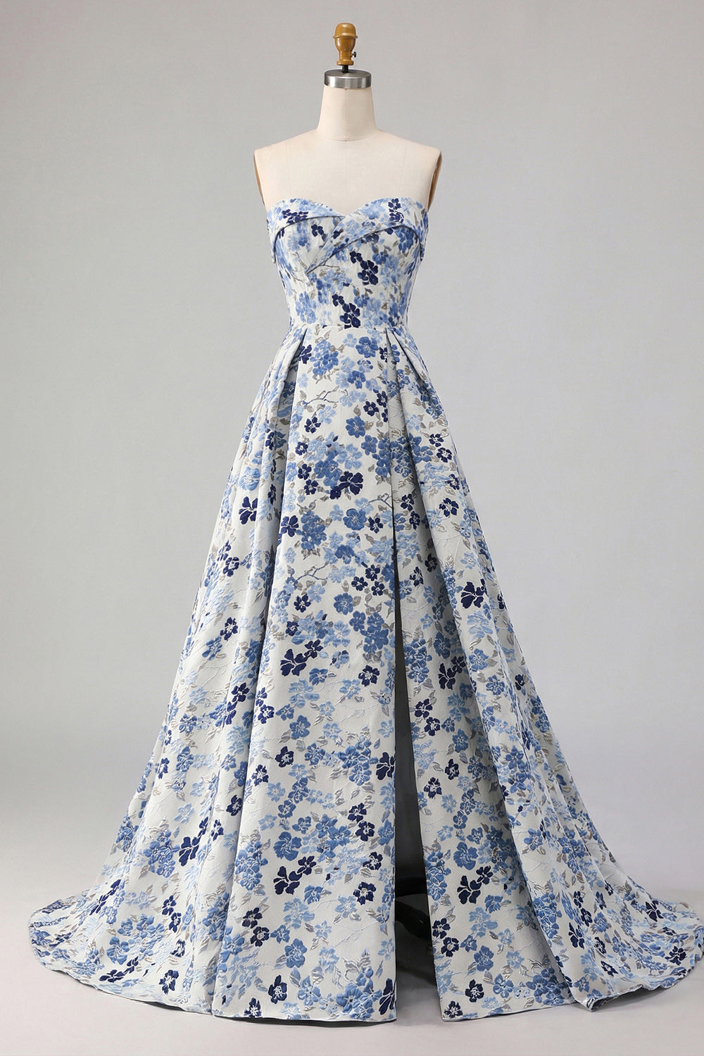 Blue Flower Printed Strapless A Line Long Ball Dress with Slit