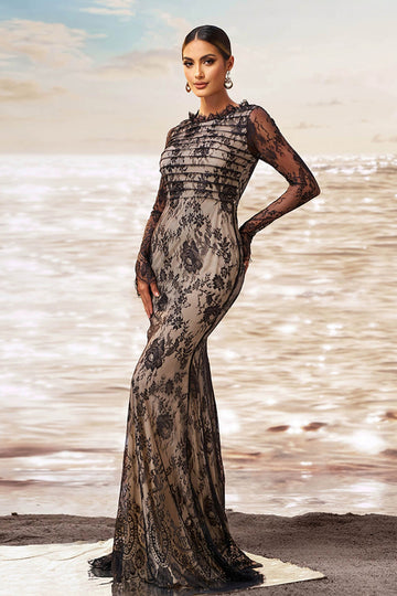 Black Apricot Mermaid Ruffled Neck Long Sleeves Ruched Lace Long Formal Dress