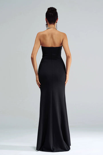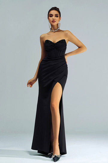 Black Mermaid Strapless Sequined Ruched Corset Long Formal Dress with Slit