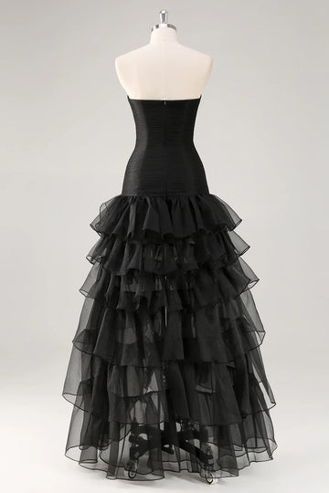 Strapless Black Tiered Ruffles Tulle Formal Dress
