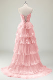 Glitter Blue A Line Strapless Sequin Corset Tiered Long Prom Dress