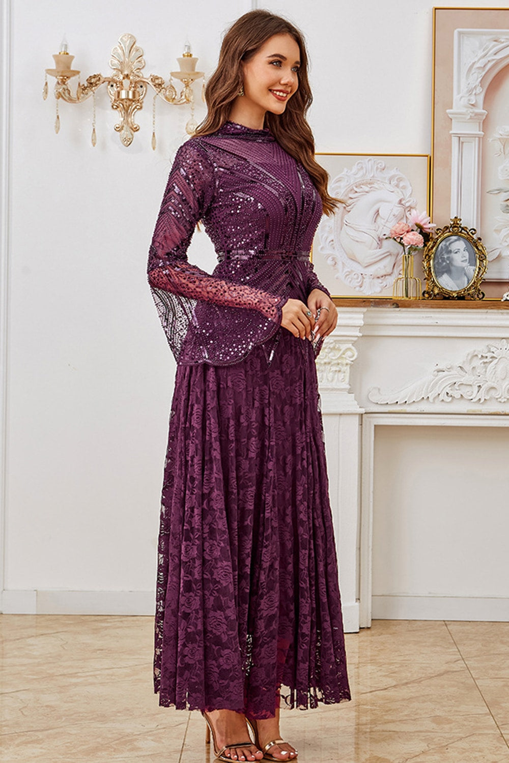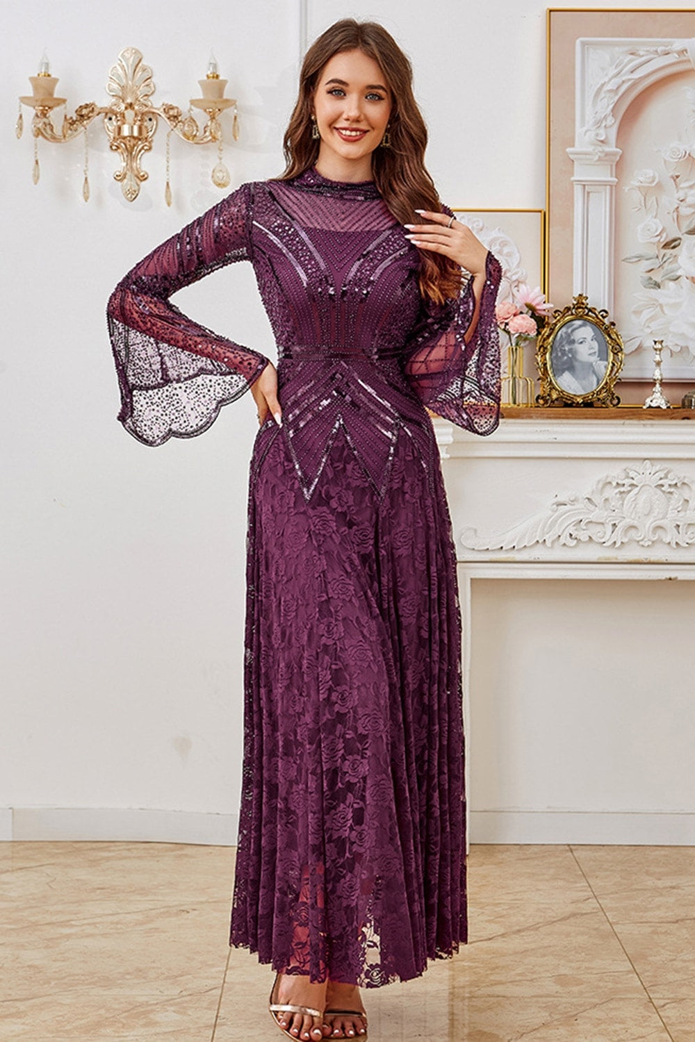 Dark Purple Beaded A Line Mother of the Bride Dress with Long Sleeves