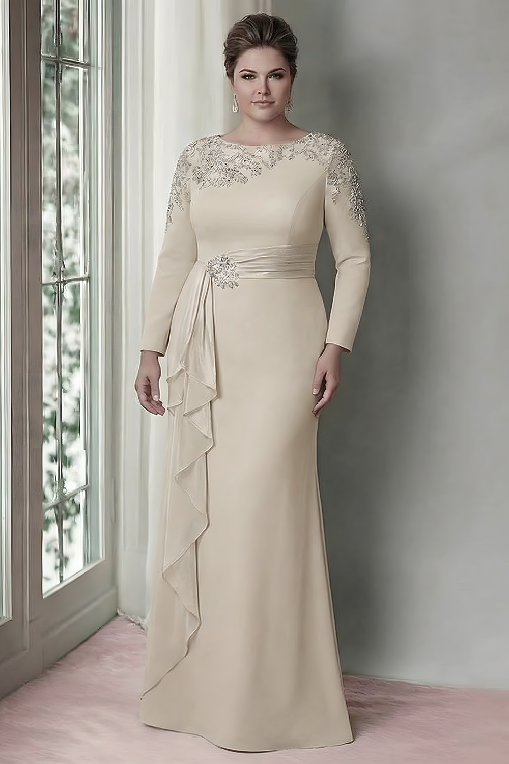 Sheath Blush Long Sleeves Satin Plus Size Mother Of The Bride Dress with Ruffles
