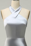 Sheath Halter Neck Silver Long Bridesmaid Dress