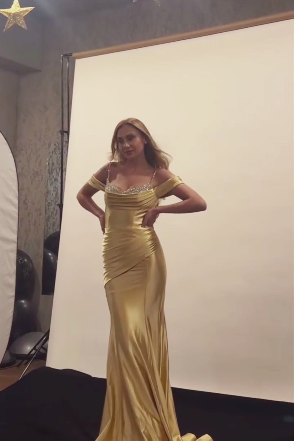 Sparkly Golden Cold Shoulder Sequined Mermaid Satin Long Plus Size Prom Dress