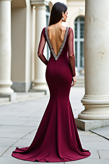 Elegant Mermaid Backless Burgundy Formal Dress with Long Sleeves