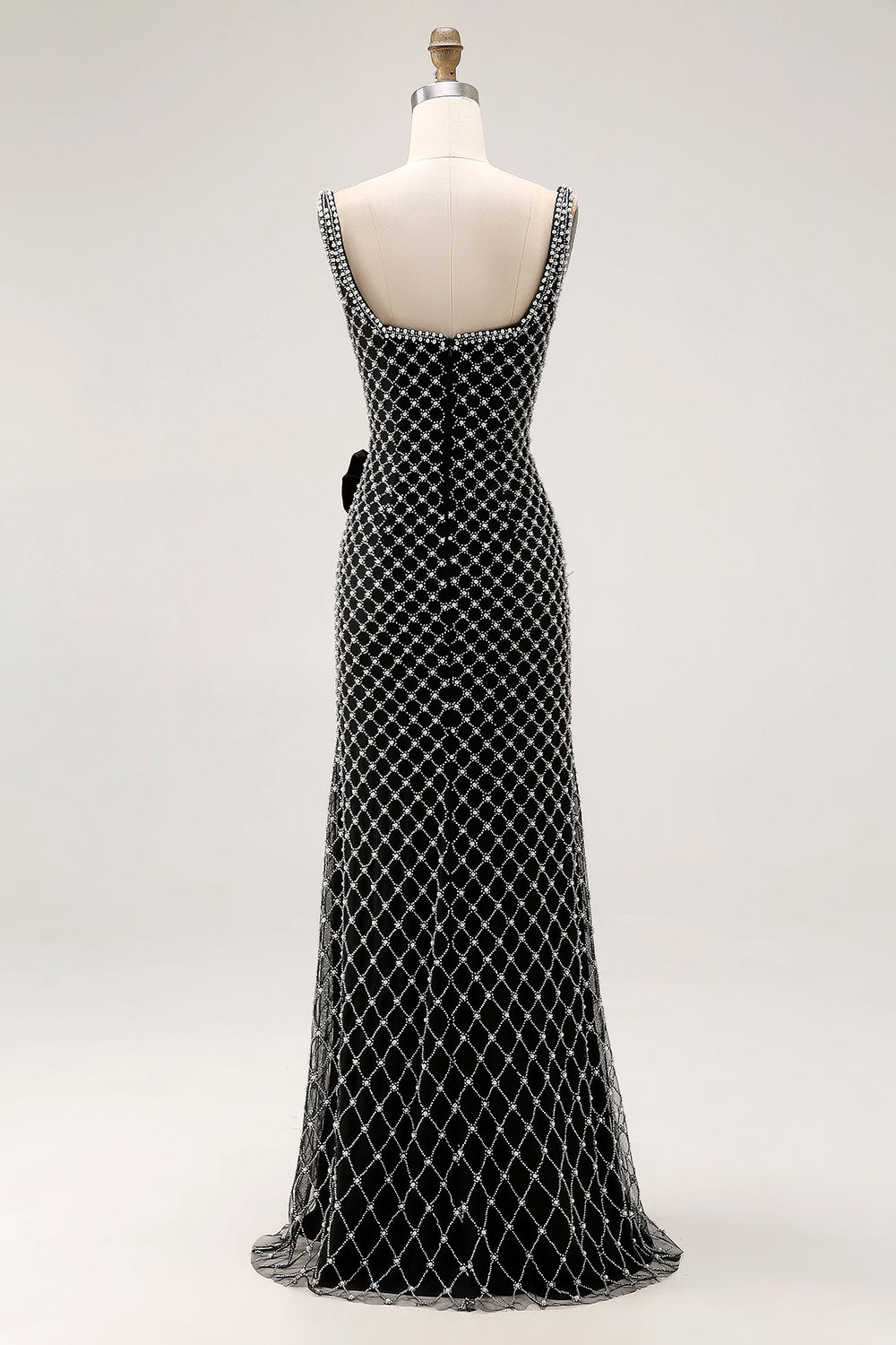 Black Mermaid Beaded Spaghetti Straps Rhinestone Side Bow Long Prom Dress with Slit
