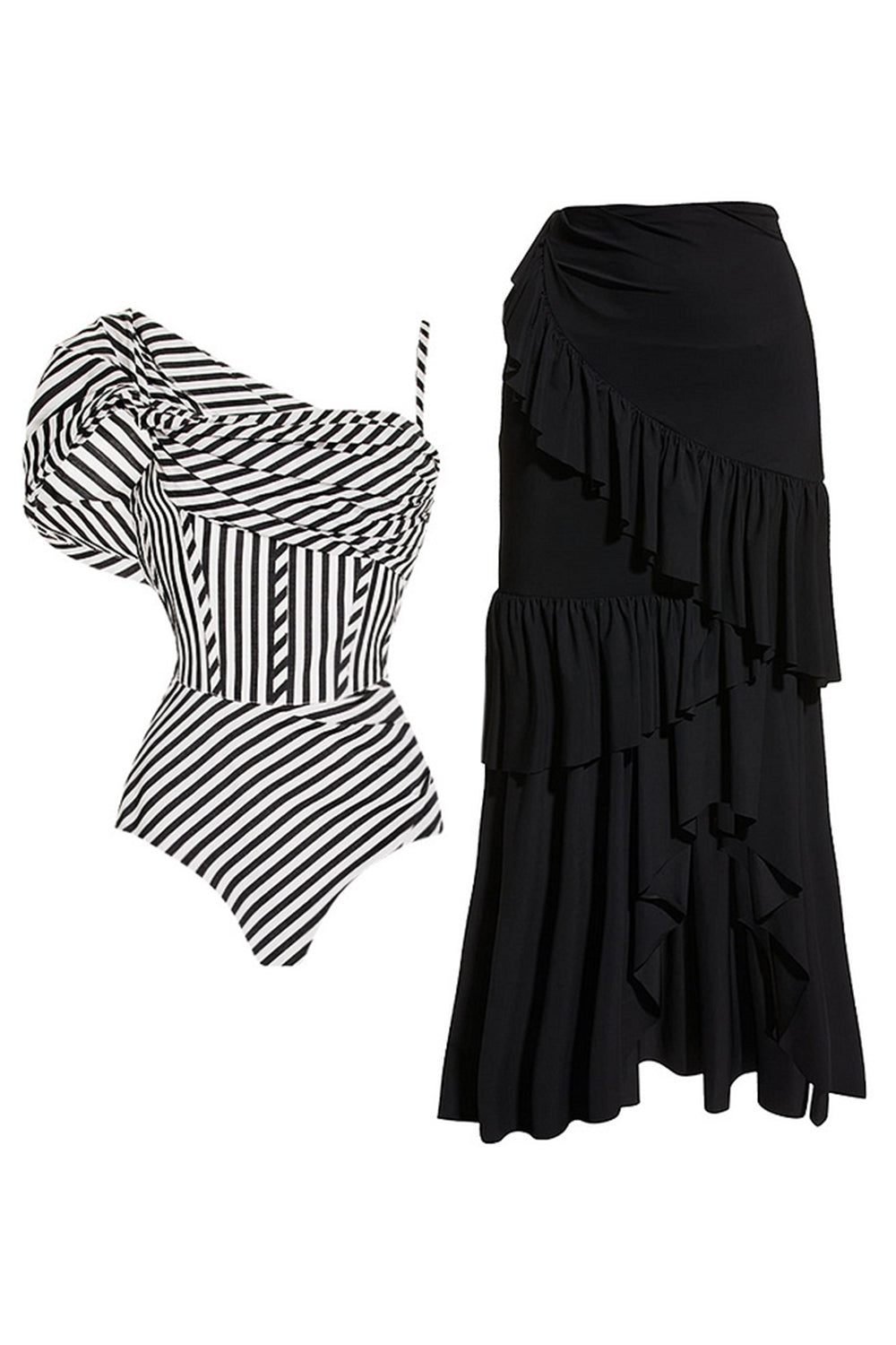 Black Striped 2 Piece Ruffled Swimsuit with Beach Dress