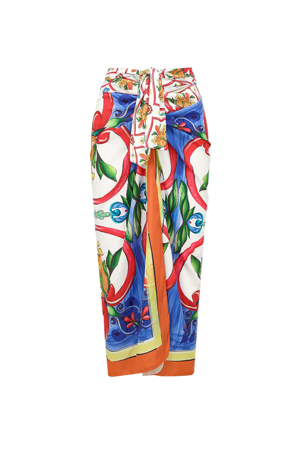 One Shoulder Orange Blue Ruffled 2 Piece Printed Swimsuit