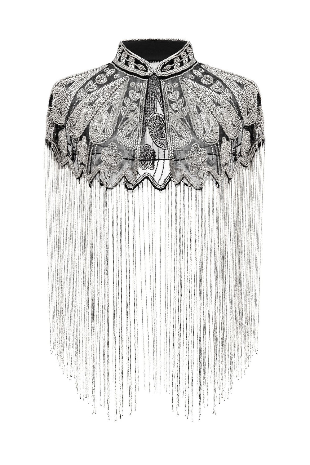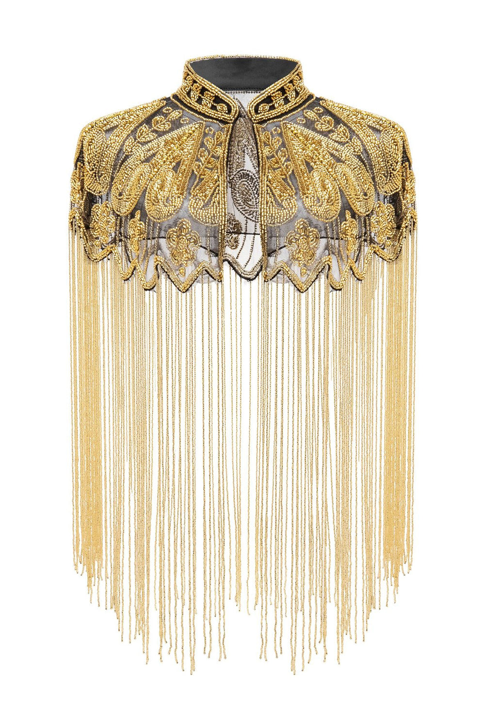 Sparkly Black Golden Beaded Fringed 1920s Cape