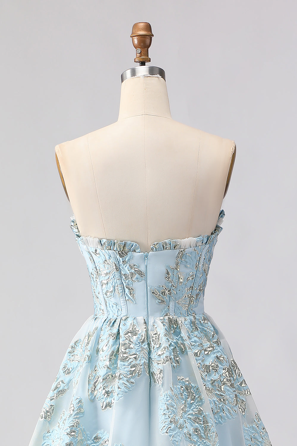 Strapless A Line Pink Jacquard Corset Long Ball Dress with Slit