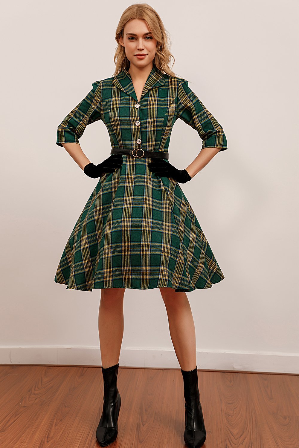 Green Plaid 3/4 Sleeve Dress