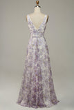 Ivory Purple Printed V-Neck Ball Dress With Slit