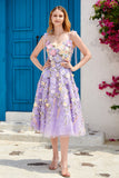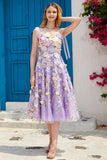 Purple A Line Tea Length Prom Dress with 3D Flowers