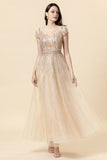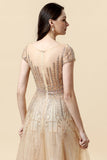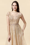 A Line Round Neck Golden Beaded Floor Length Ball Dress