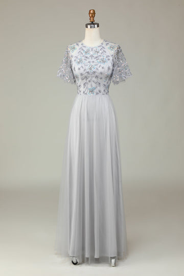 A-Line Tulle Beaded Long Grey Bridesmaid Dress with Appliques