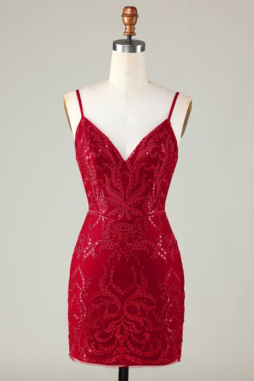 Sparkly Dark Red Sequins Spaghetti Straps Tight Short Homecoming Dress