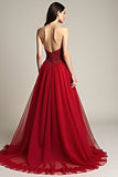 A Line Sequin Burgundy Strapless Tulle Long Prom Dress