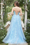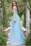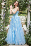 A Line Spaghetti Straps Blue Long Ball Dress with Appliques