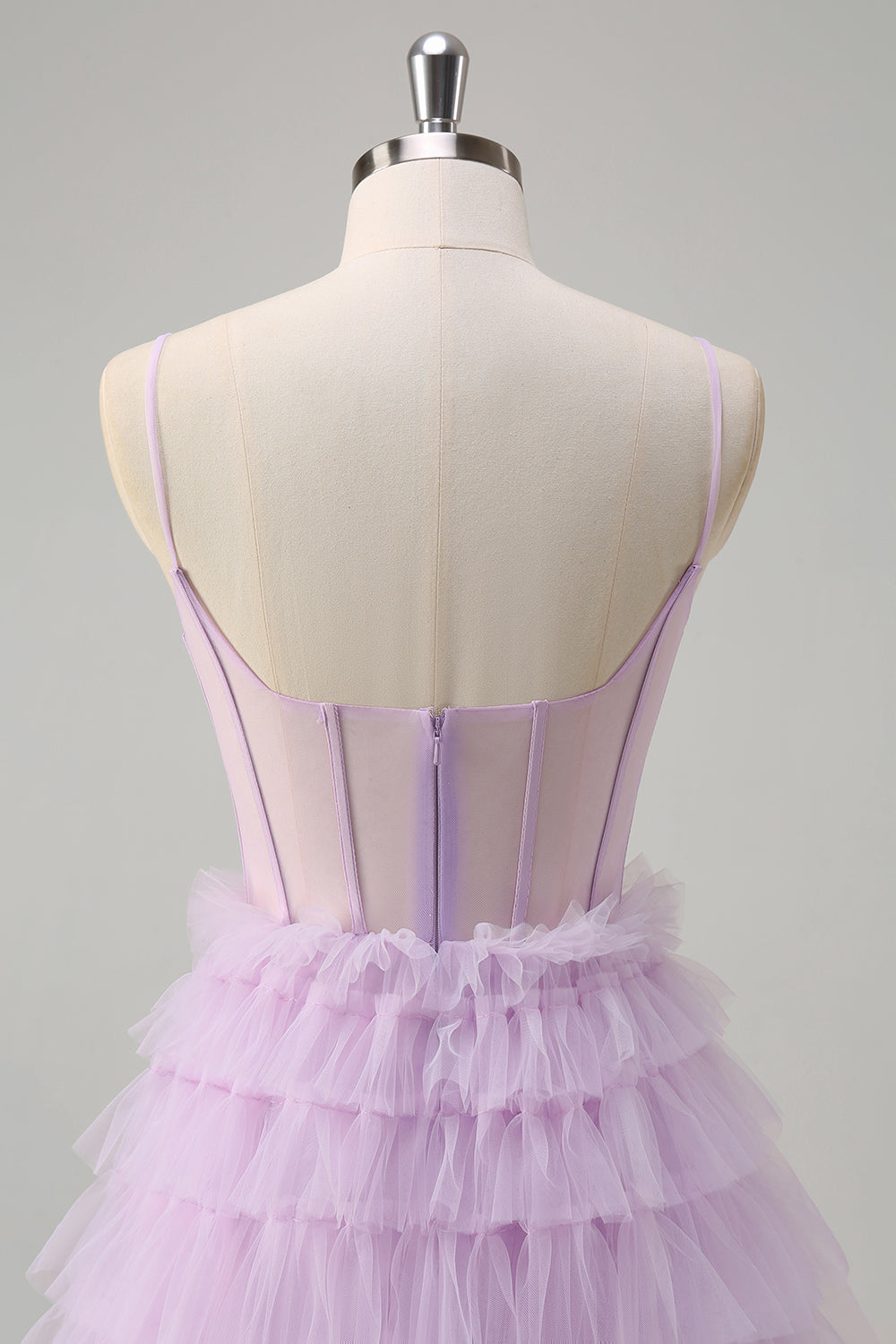 Light Purple A-Line Tiered Corset Sheer Long Prom Dress with Ruffles