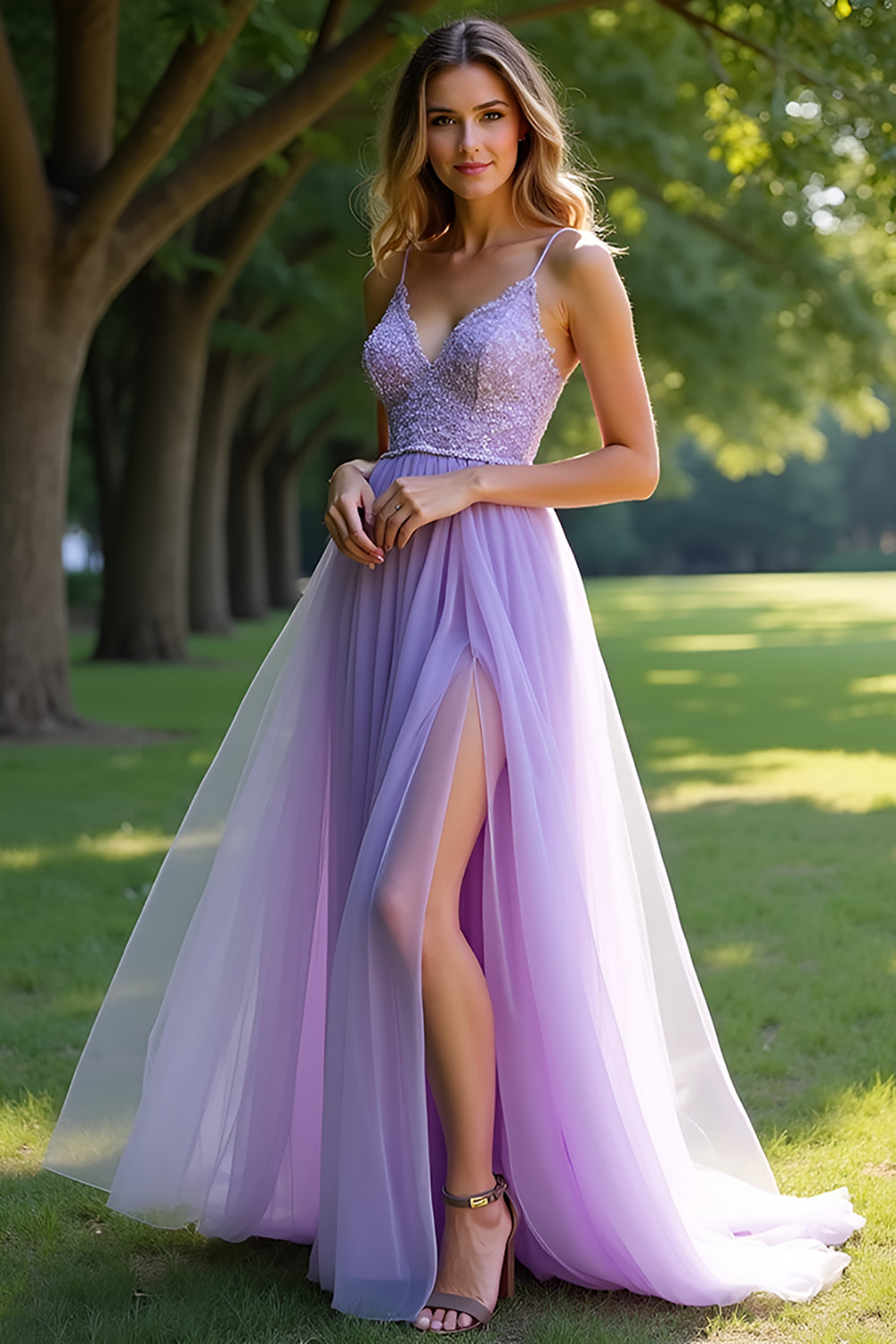 Sparkly Lilac A Line Spaghetti Straps Lace Long Prom Dress With Slit