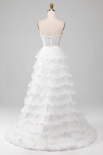White A-Line Sparkly Sequin Ruffle Skirt Corset Ball Dress With Slit