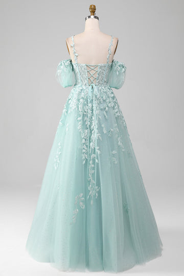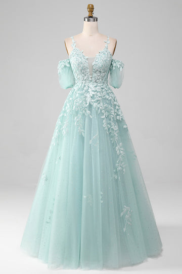 Green A-Line Spaghetti Straps Removable Sleeves Tulle Ball Dress with Appliques