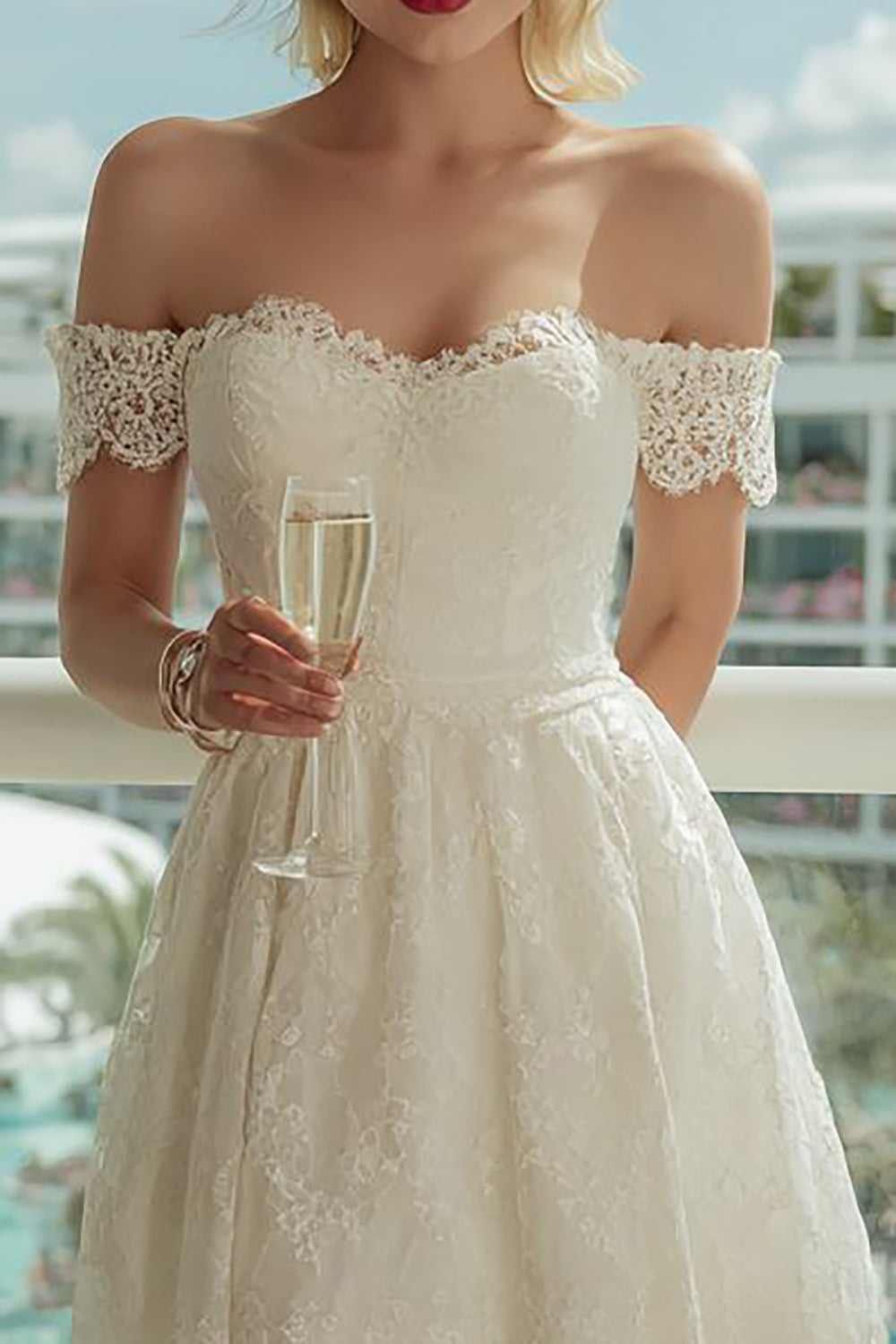 Ivory Off the Shoulder Lace A Line Midi Wedding Dress