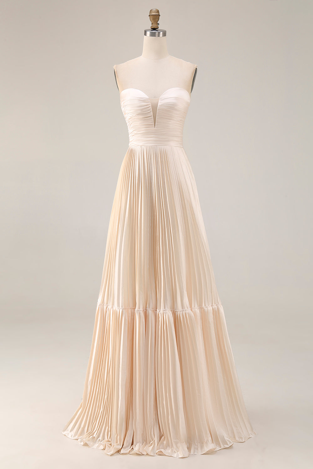 Champagne Strapless A Line Pleated Long Wedding Guest Dress