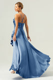 Blue Asymmetrical Cowl Neck Satin Bridesmaid Dress with Slit