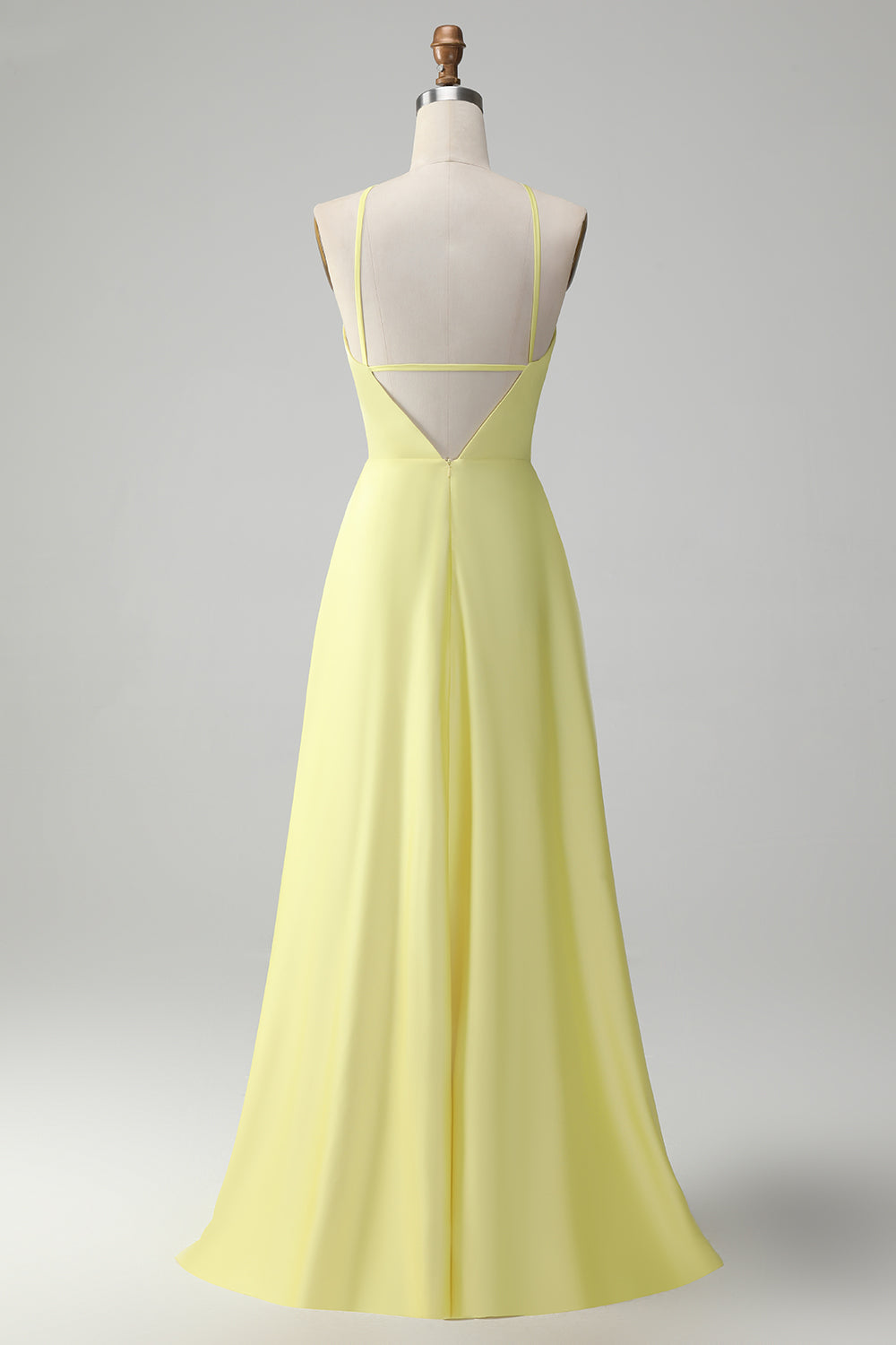 Yellow A Line Halter Cut Out Long Bridesmaid Dress with Flower