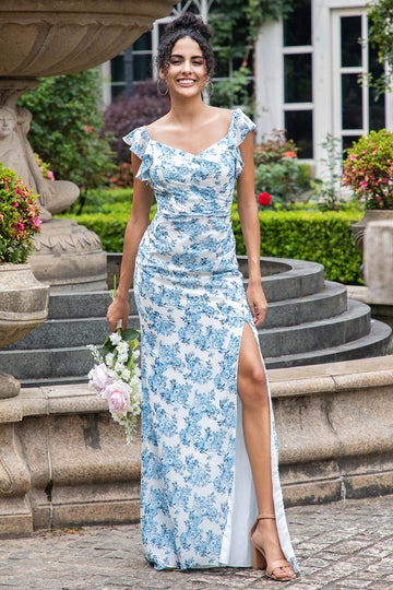 Blue Ruffled Floral Bridesmaid Dress with Slit