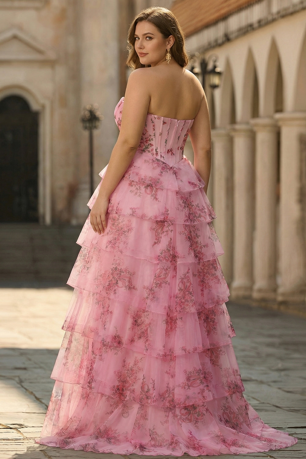 Blue White Flower A-Line Basque Waist Tiered Long Plus Size Prom Dress with Slit