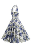 Halter White Blue A Line Floral Printed 1950s Dress