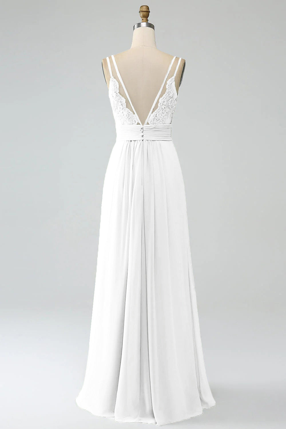 White A-Line Spaghetti Straps Pleated Chiffon Long Bridesmaid Dress