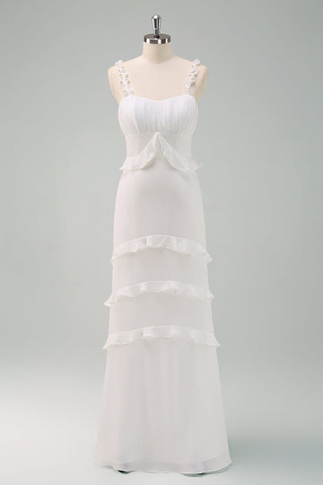 White Spaghetti Straps Mermaid Long Ball Dress with Ruffles