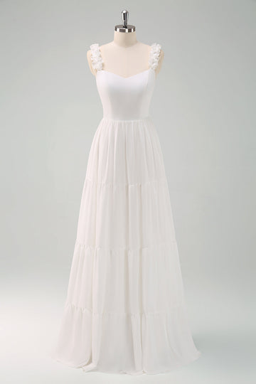 White Brown Flower A Line Spaghetti Straps Bridesmaid Dress With Ruffles