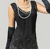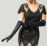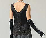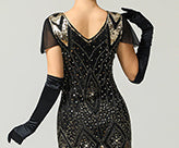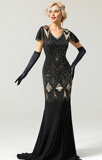 This black-golden 1920s dress is also from our 1920S Dress Collection. Featuring a rich black and golden color, this dress is very popular.The cap sleeves and V neck design shows you off with a modest touch. The classic, elegant, style, and floor length and the art deco design pairs perfectly to make this dress look amazingly on every body shape.
