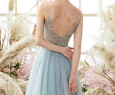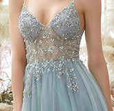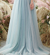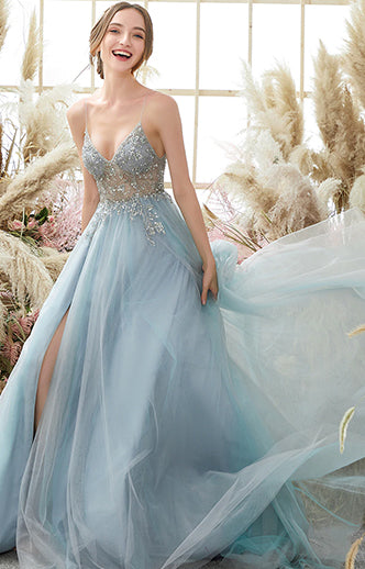 This light blue dress is from our Formal Evening Dress Collection. It has been one of our best-selling dresses for a year. This dress put the very fine fabric to use, it looks even more gorgeous in person. Featuring a deep v-neck and an A-line silhouette, this dress is made with very soft tulle that is super comfortable to skin.