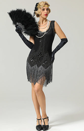 This classic 1920s dress is from our 1920s Dress Collection. It holds a very classic flapper style, which makes it being the lasting best-selling 1920s dress on our site. Featuring an open round neck, a short style and fringe hemline, this sequined 1920s dress has all the classic elements. Perfect for occasions like 1920s theme party, and other vintage-inspired parties.
